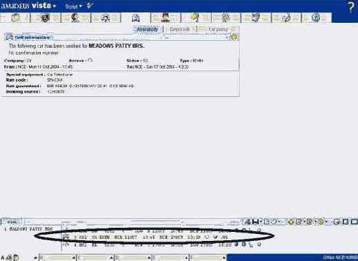 Amadeus Vista выдает на экран полную информацию о забронированном автомобиле. Сегмент с забронированной арендой автомобиля будет представлен в PNR области.
