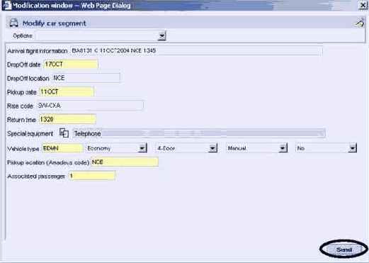 Для внесения изменения в сегмент бронирования автомобиля, необходимо кликнуть на него два раза. В появившееся окно ‘Modification window’ введите изменения и кликните на Send